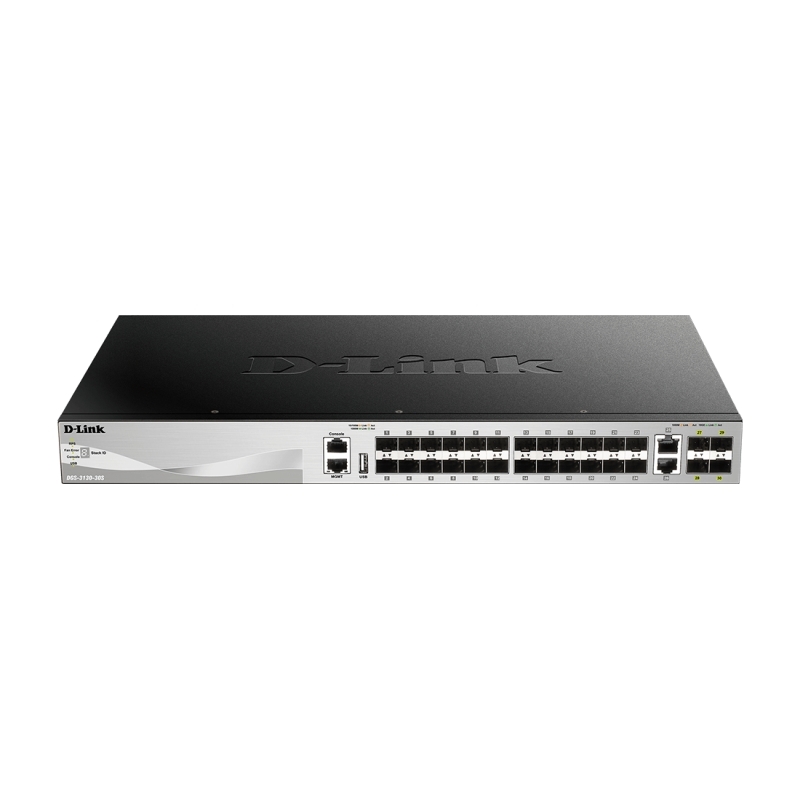 Dlink 30 port Stackable Gigabit Switch with 24 SFP ports and 4 10 Gigabit SFP+ ports and 2 10GBASE-T ports. DGS-3130-30S
