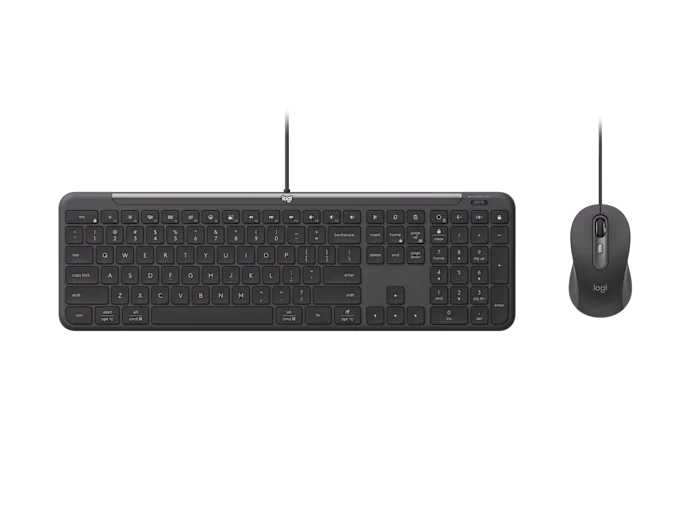 Multi-OS USB-C keyboard and mouse combo with laptop-style typing and ambidextrous mouse for workplaces that require wired connectivity.