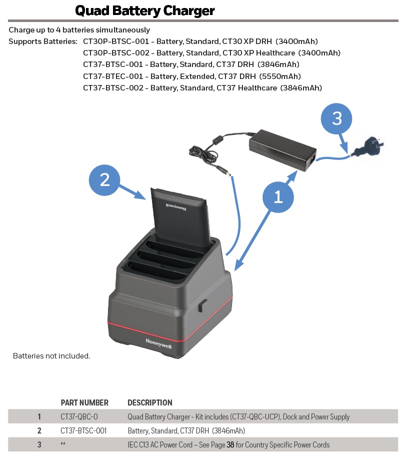 CT37/CT30 XP QBC, kit includes quad battery charger(Cup:CT37-QBC-UCP), power supply, power cord must be ordered separately. For recharging up to four batteries. It´s compatible with CT30 XP battery and CT37 both standard and extended battery.