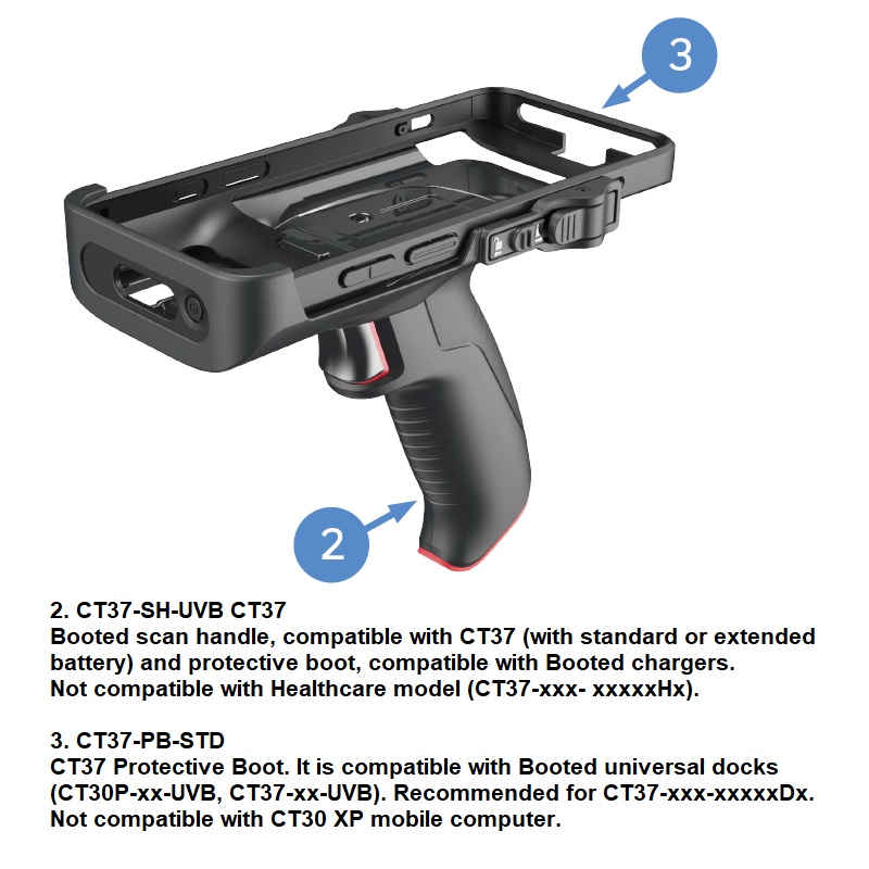 CT37 scan handle compatible with CT37 (w/ standard and extended battery) with protective boot; compatible with booted chargers. order CT37-PB-STD protective boot separately