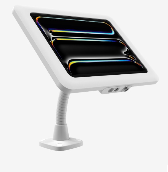 The Elite Flex Arm features a flexible, adjustable arm with a secure, lockable tablet holder, perfect for commercial settings. It offers easy installation and internal cable management, making it an ideal solution for secure and interactive countertop displays. Available in white and black.