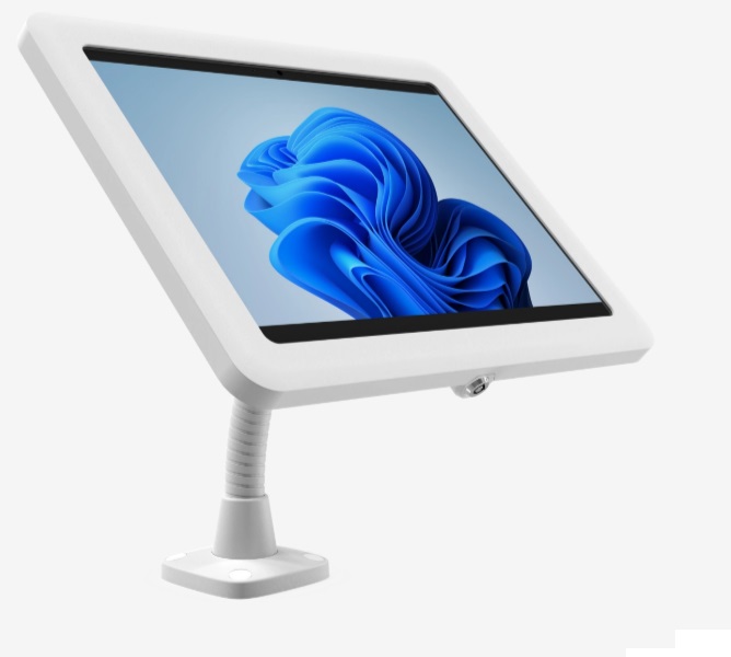 The Elite Flex Arm features a flexible, adjustable arm with a secure, lockable tablet holder, perfect for commercial settings. It offers easy installation and internal cable management, making it an ideal solution for secure and interactive countertop displays. Available in white and black.