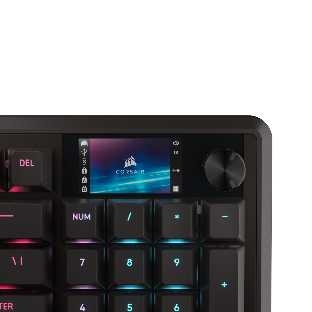 CORSAIR’s VANGUARD 96 pulls off the astonishing feat of shrinking a full keyboard with arrow keys, a tenkey pad, an LCD screen, rotary dial, and 6 programmable G-keys into a super-compact frame. Featuring wobble-free pre-lubricated CORSAIR MLX switches, it’s also hotswappable, supporting compatible 3-pin and 5-pin switches. The stunning LCD screen takes keyboard personalization to the next level with animations, stats, and game integration support. Quad-layer sound dampening provides satisfying keypress acoustics, and 8,000Hz hyper-polling delivers lightning-fast inputs. VANGUARD 96 also features Elgato Virtual Stream Deck integration, FlashTap SOCD handling, and easy customization via our web-based utility, CORSAIR Web Hub.